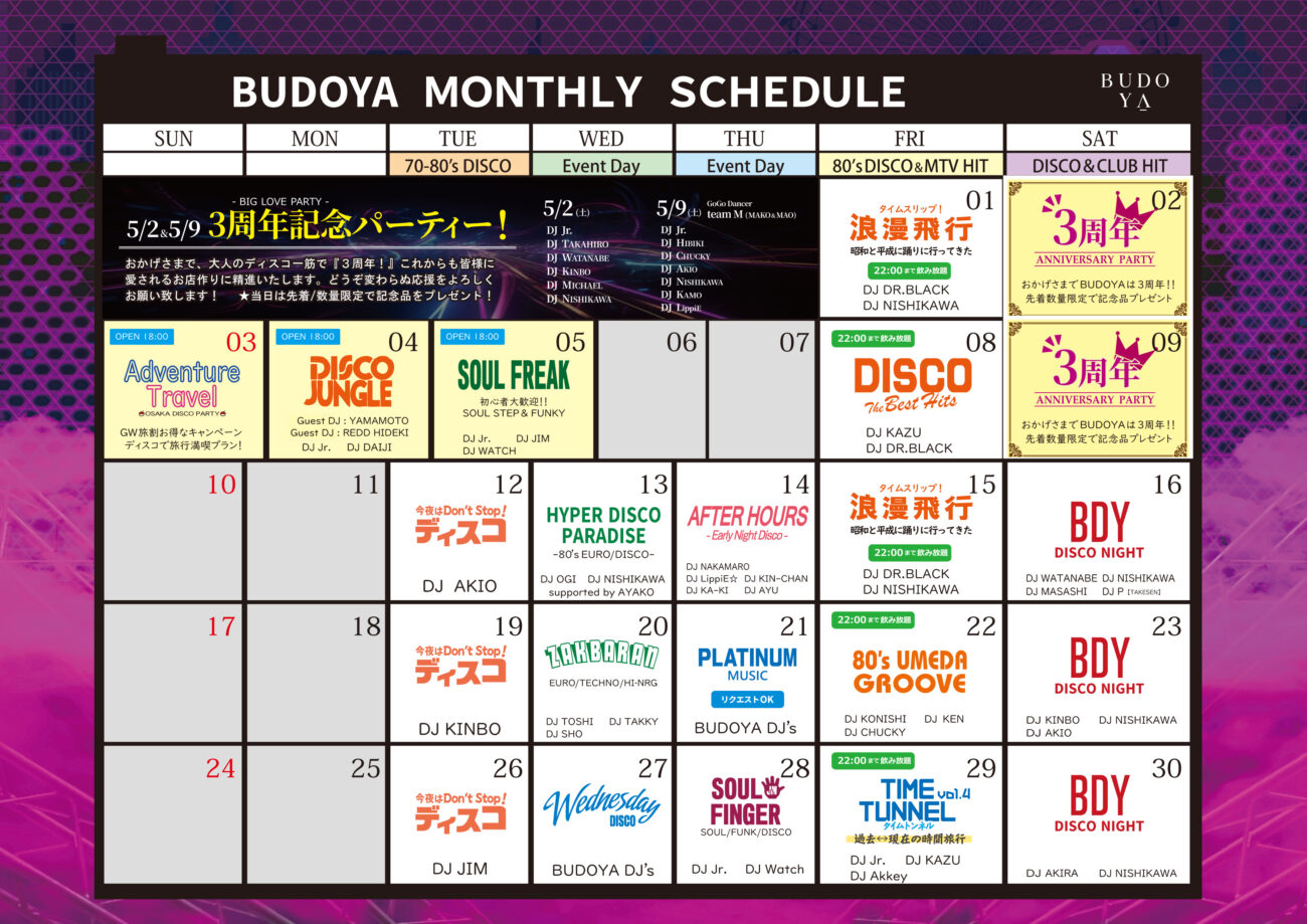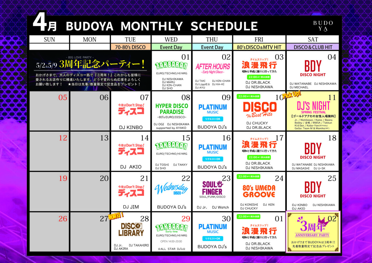 BUDOYAのスケジュール一覧です。